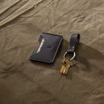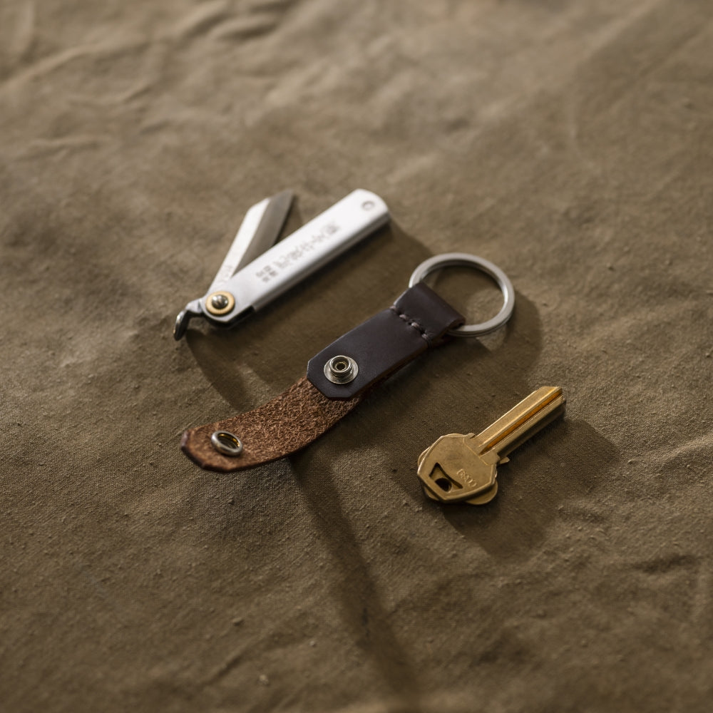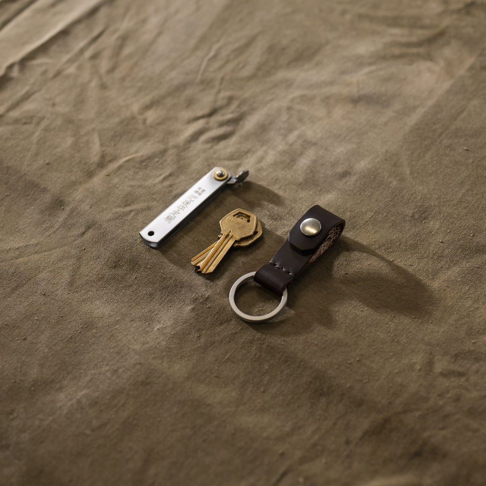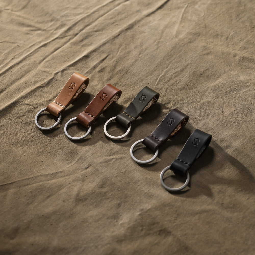 Robust key carry made from vegetable tanned leather. Hand-stitched construction with beeswax-coated linen thread. Thanks to the heavy-duty stud closure, keys can be easily collected on the belt.