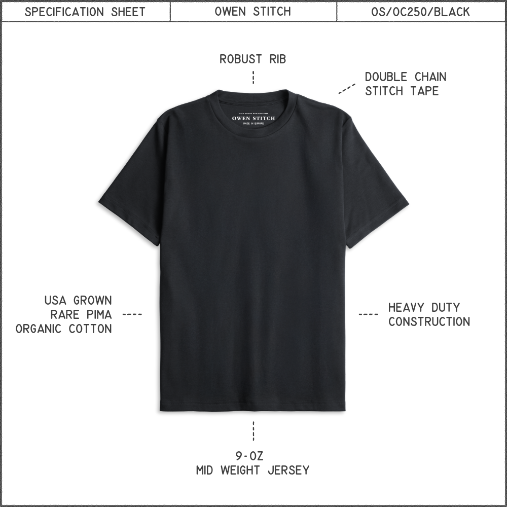 Craftsmanship heavy-duty t-shirt with reinforced stitch construction. Made with 100% pima organic cotton sourced directly from a family-run farm in Mesilla Valley, New Mexico. Extra-long-staple fibers ensure substantial comfort and structure. Everyday comfort of mid-weight 9-oz fabric and regular fit.