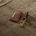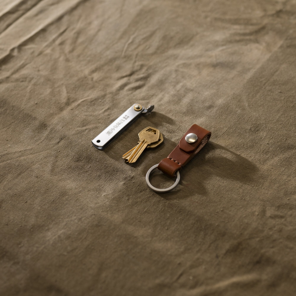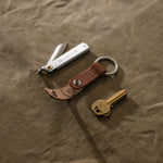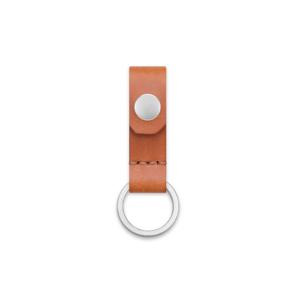 Robust key carry made from vegetable tanned leather. Hand-stitched construction with beeswax-coated linen thread. Thanks to the heavy-duty stud closure, keys can be easily collected on the belt.